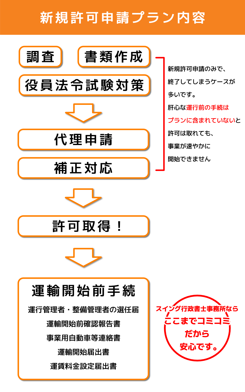 新規許可申請の要件に適合しているかの調査、書類作成、申請、補正対応、法令試験対策、運輸開始手続を含んだ内容となります。