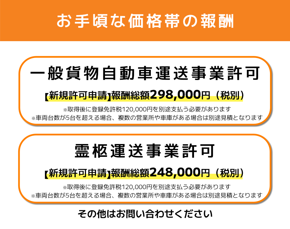 一般貨物運送業許可の新規申請を行う場合は、無料相談によるヒアリング後に、「着手金」として報酬を半額お支払いいただきます。その後申請書類が完成して申請できる状態になりましたら残りの報酬をお支払いいただきます。